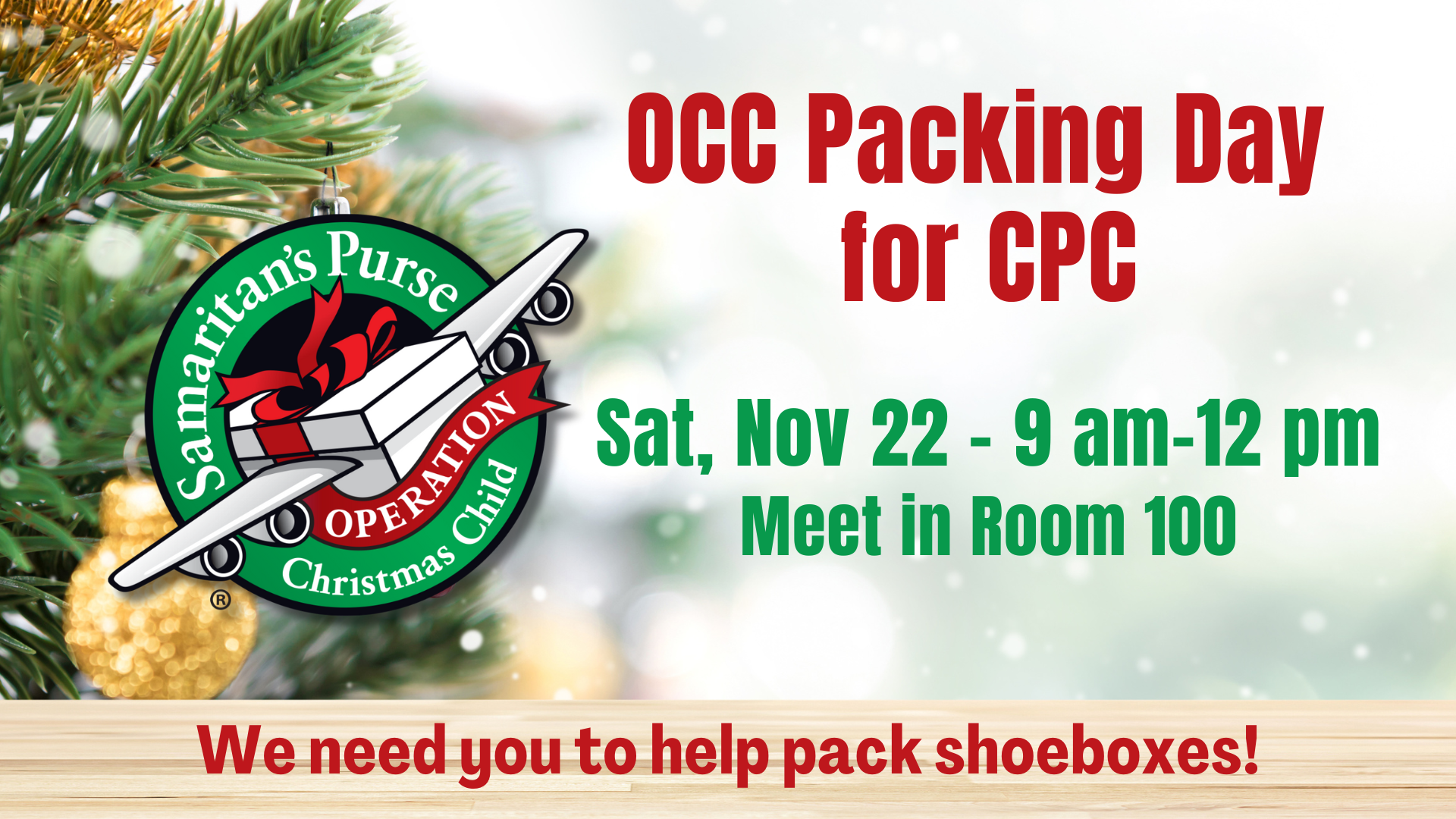 Saturday, November 22, 2025, 9:00 AM - 12:00 PM Download: Download EventEveryone is invited to come and pack Operation Christmas Child shoeboxes for children around the world - any time between 9:00 am and 12:00 pm. Please make plans to join us!