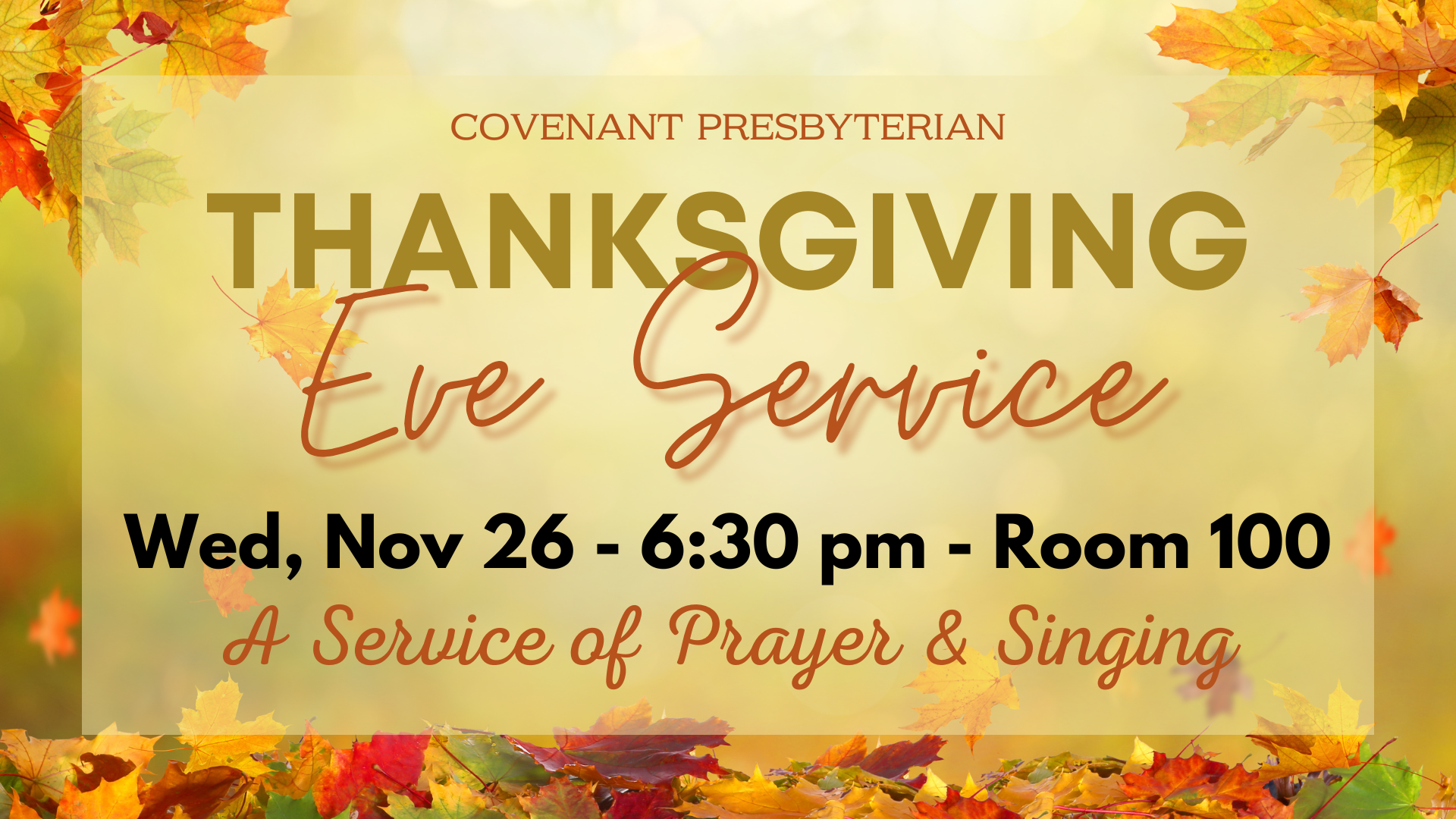 Wednesday, November 26, 2025, 6:30 PM - 7:30 PM Download: Download EventIf you are in town with family during the Thanksgiving holiday, we would love for you and your family to join us for a special time of prayer and singing at 6:30 pm in Room 100 (Schum Fellowship Hall).