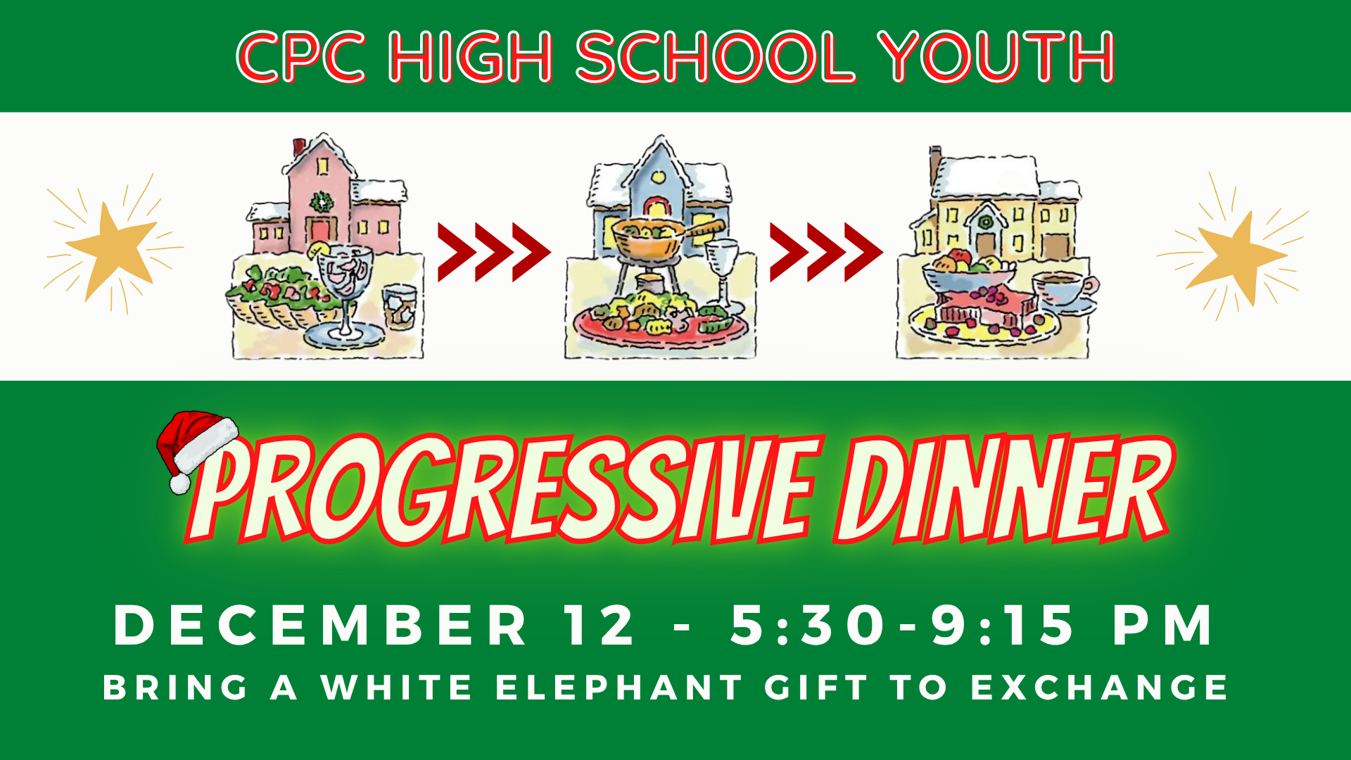 We hope you can join us for the High School Progressive Dinner! We will rotate through three families' homes for appetizers, the main meal, and dessert! Please let Heather Morrison know if you will be attending.