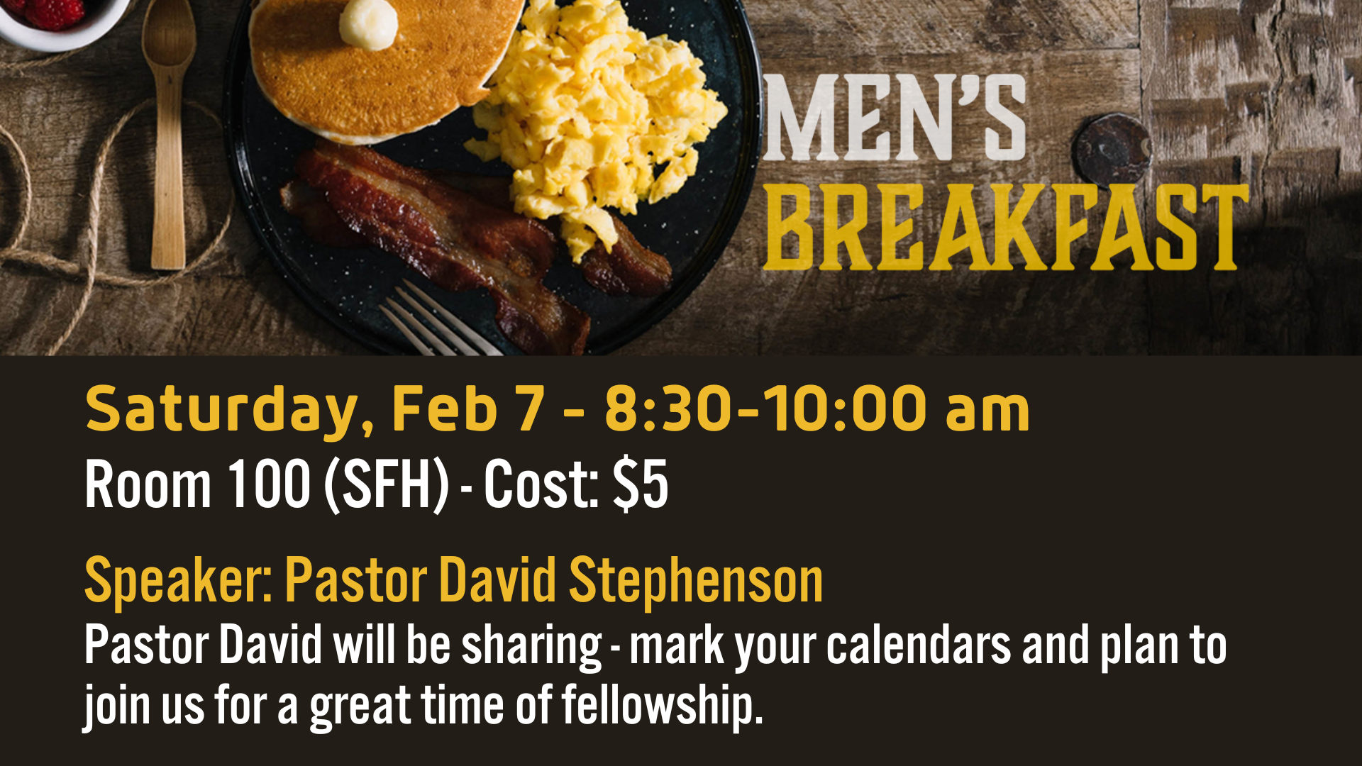 Men, mark your calendar and plan to join us for the Men’s Breakfast. We look forward to you joining us for this encouraging time of fellowship. Pastor David Stephenson will be sharing with us.