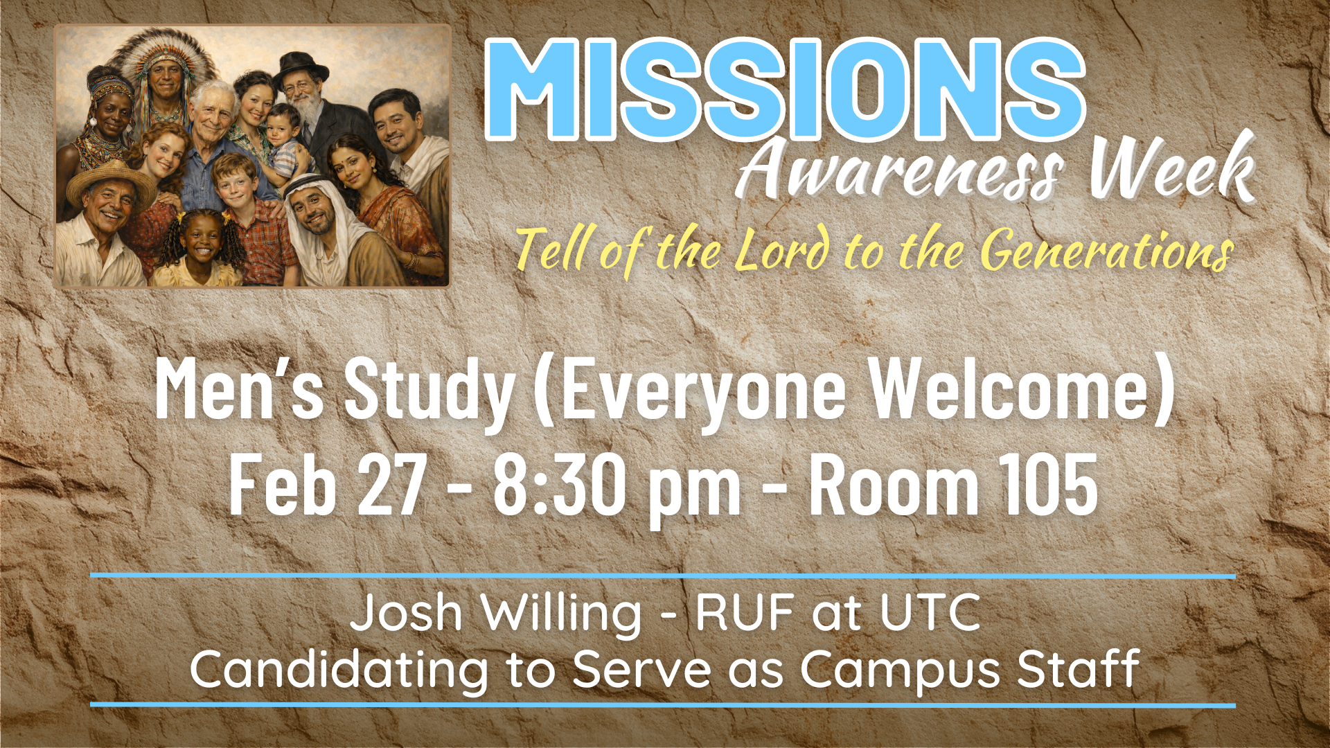 Friday, February 27, 2026, 8:30 AM - 10:00 AM Download: Download EventJoin us for a special Missions-focused presentation in Room 105 (Frederick Room). Everyone is welcome to attend.
