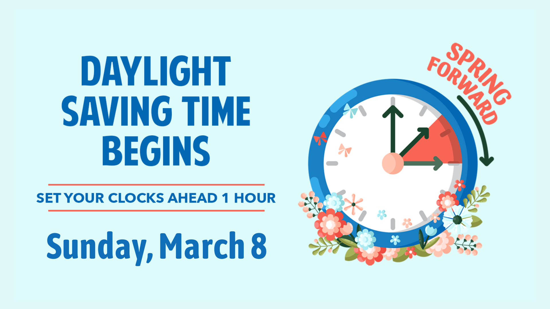 Sunday, March 08, 2026 Download: Download EventDaylight saving time begins at 2:00 AM. Be sure to set your clocks FORWARD one hour before bedtime on Saturday night.