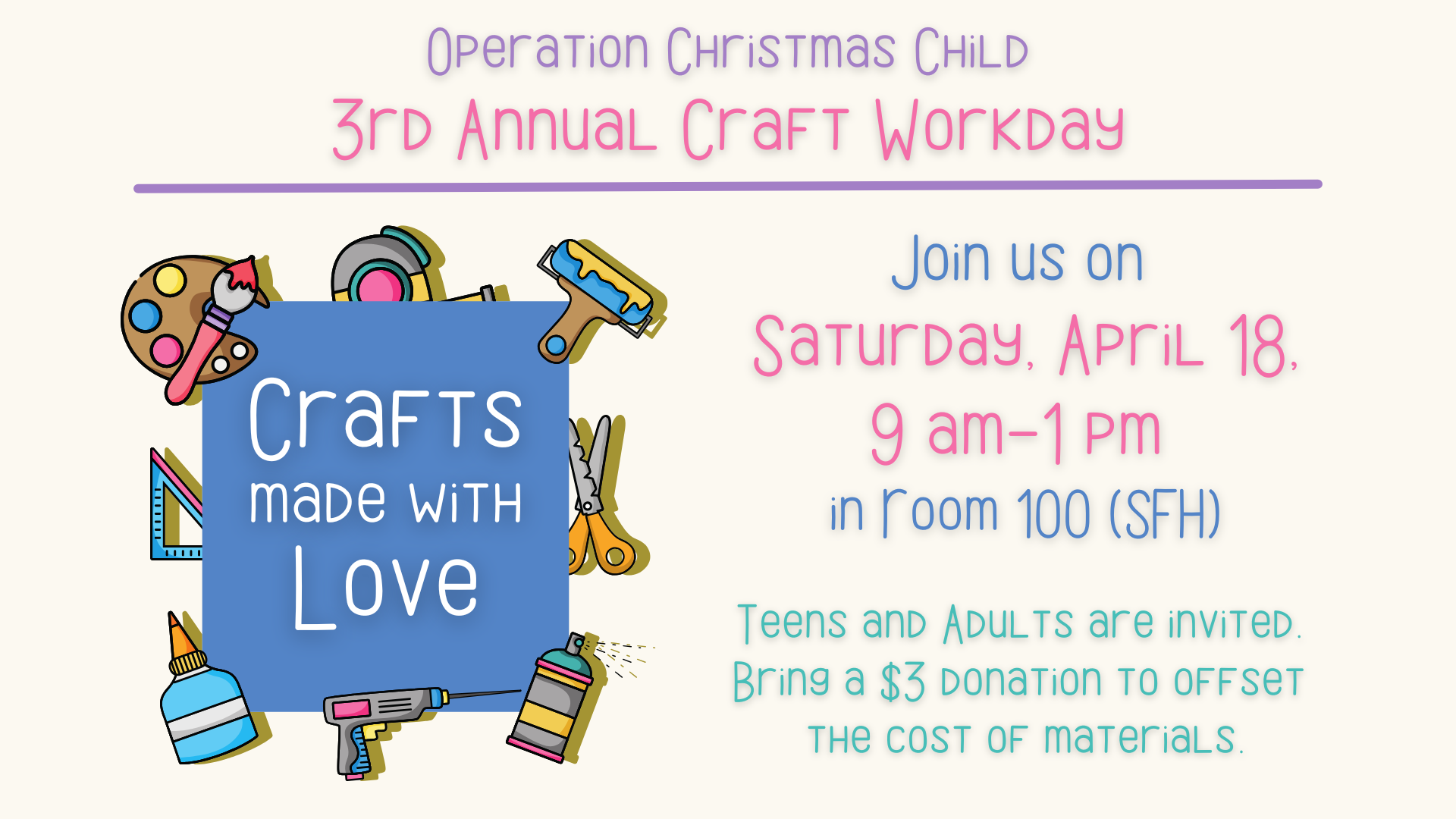 Everyone is invited to come make crafts, which will be used in OCC shoeboxes to send to kids around the world. We will have crafts for every skill level. Middle school,high school, grandmothers, all ages are invited. It will be a fun day working together!