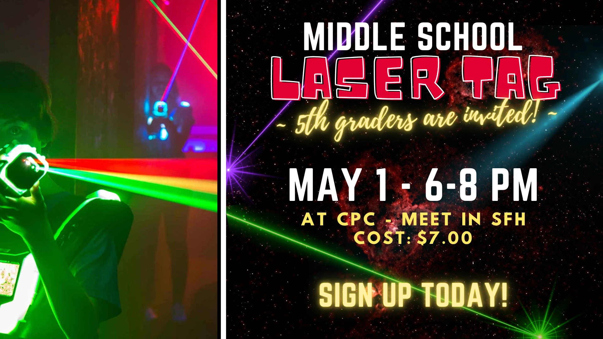 Friday, May 01, 2026, 6:00 PM - 8:00 PM Download: Download EventMiddle School students (along with 5th-grade students) are invited to join us at CPC (meet in SFH) from 6-8 pm. The cost is $7. Please fill out the form below if your student is planning to attend.