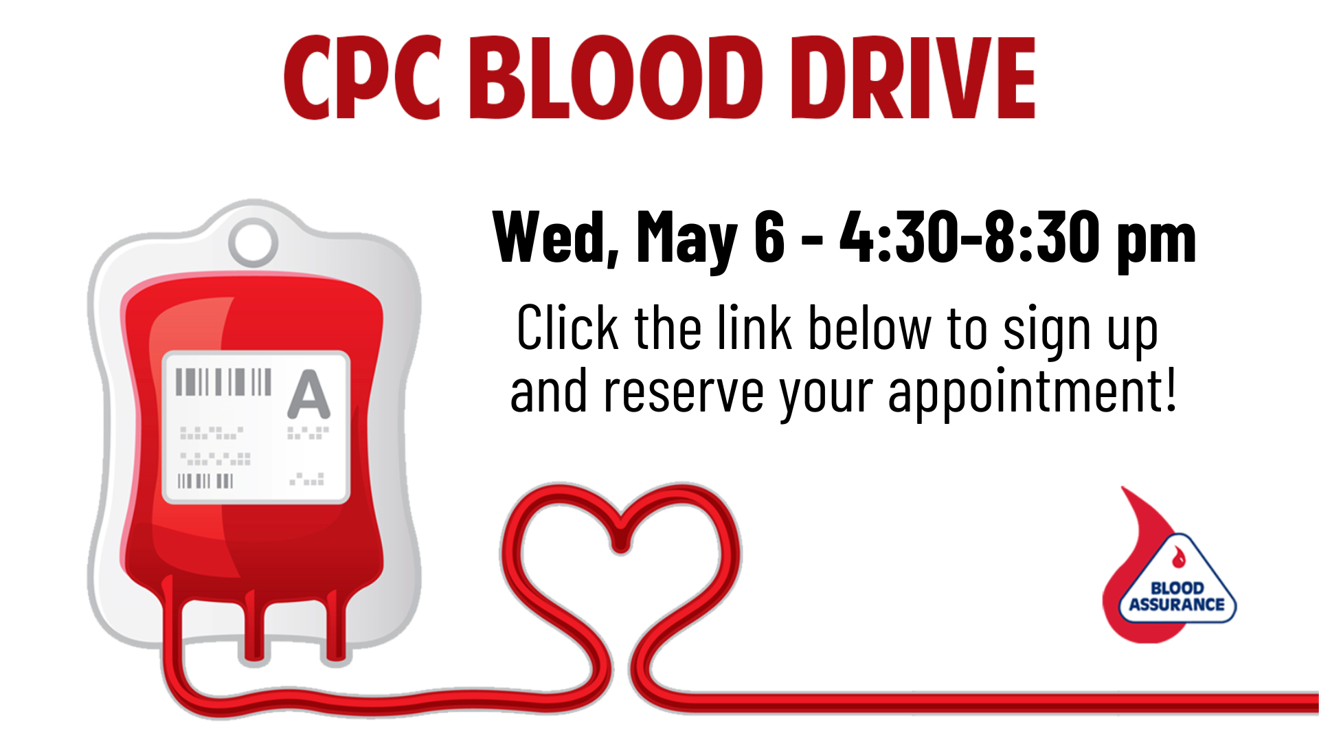CPC is hosting a blood drive in partnership with Blood Assurance. The Bloodmobile will arrive at the church and receive donations between 4:30-8:30 pm. Sign up for a time to give. Don't forget to eat a good meal, avoid energy drinks, bring your I.D., and drink extra water.