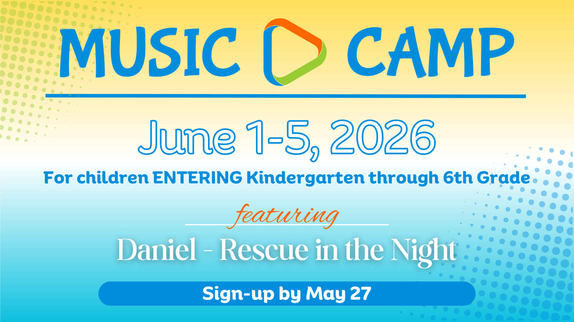 Every , 8:30 AM - 2:00 PM Download: Download EventHey Kids, mark your calendar for Music Camp. We would love to have you join us this year. Camp is open to children entering Kindergarten through 6th Grade in the fall of 2026.