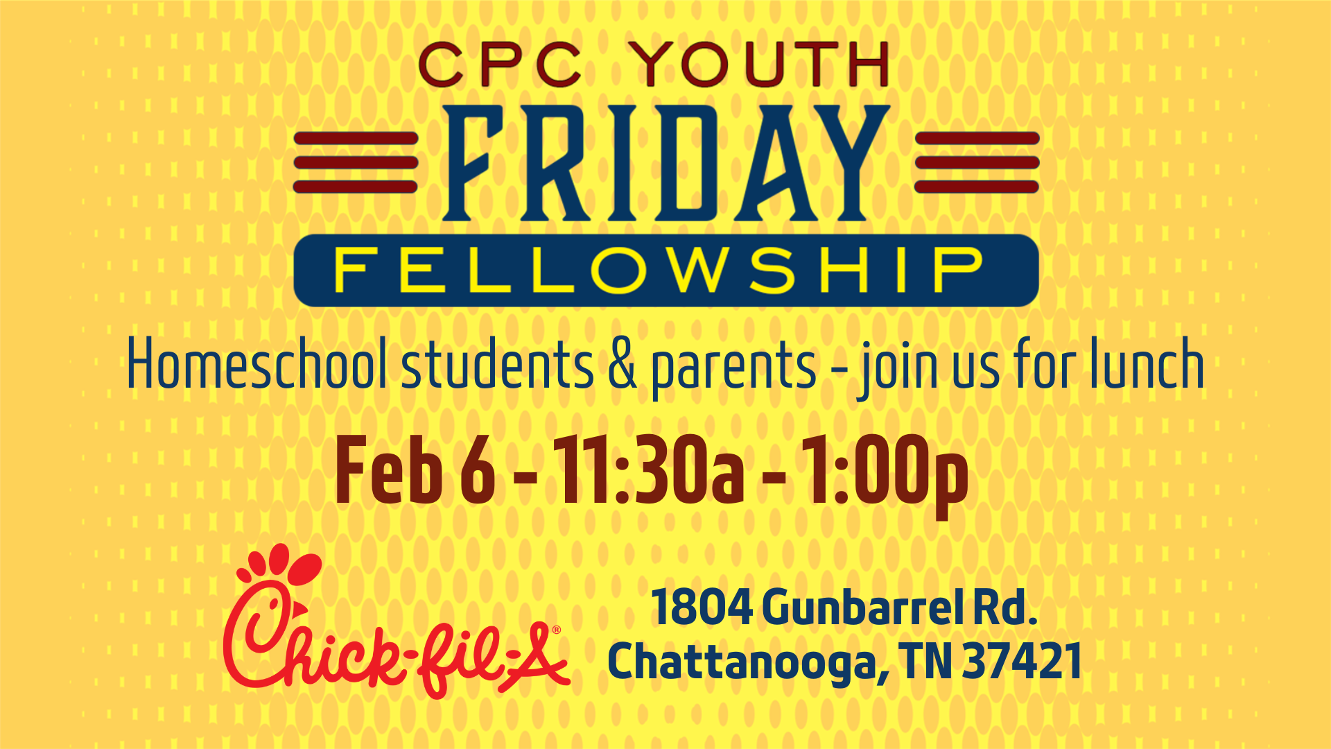 Friday, February 06, 2026, 11:30 AM - 1:00 PM Download: Download EventJoin us for a time of fellowship for our homeschooled families in Youth Ministry! Parents are welcome to participate. We will meet at Chick-fil-A - 1804 Gunbarrel Rd.