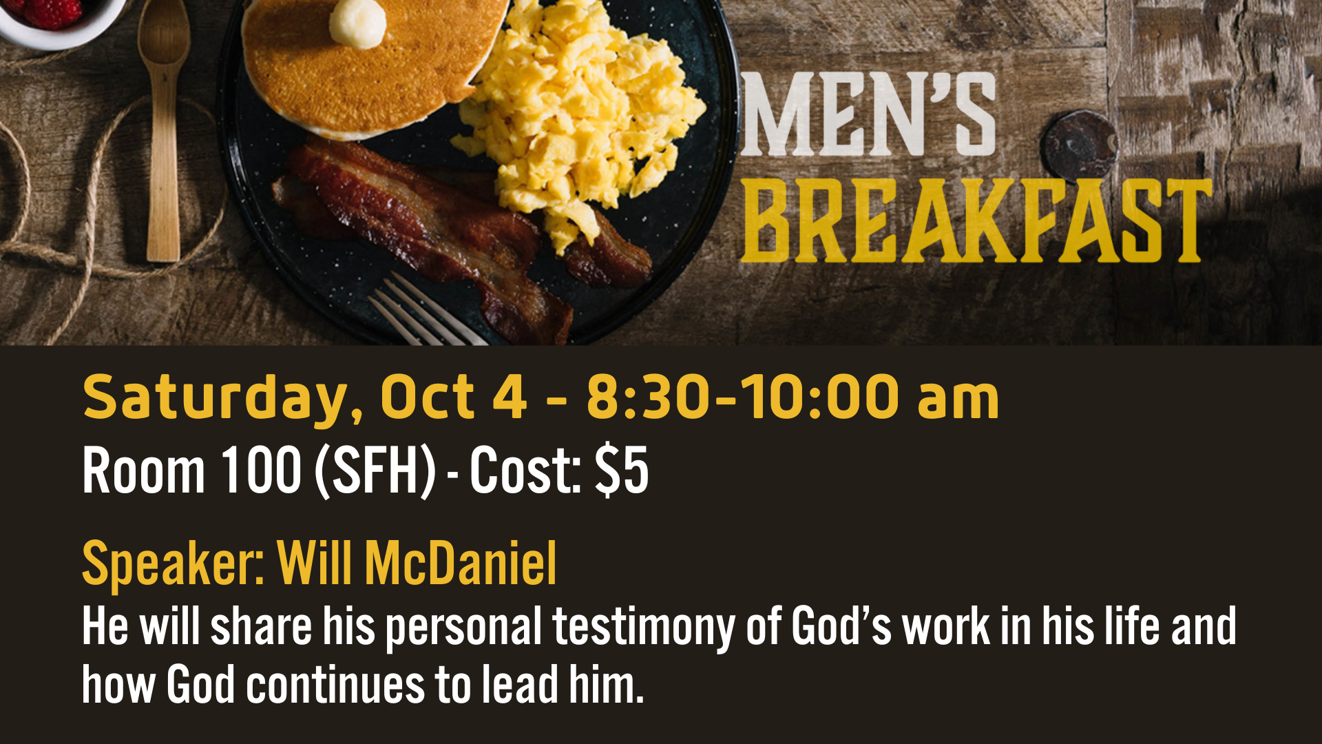 Men, mark your calendar and plan to join us for the Men’s Breakfast. We look forward to you joining us for this encouraging time of fellowship.
