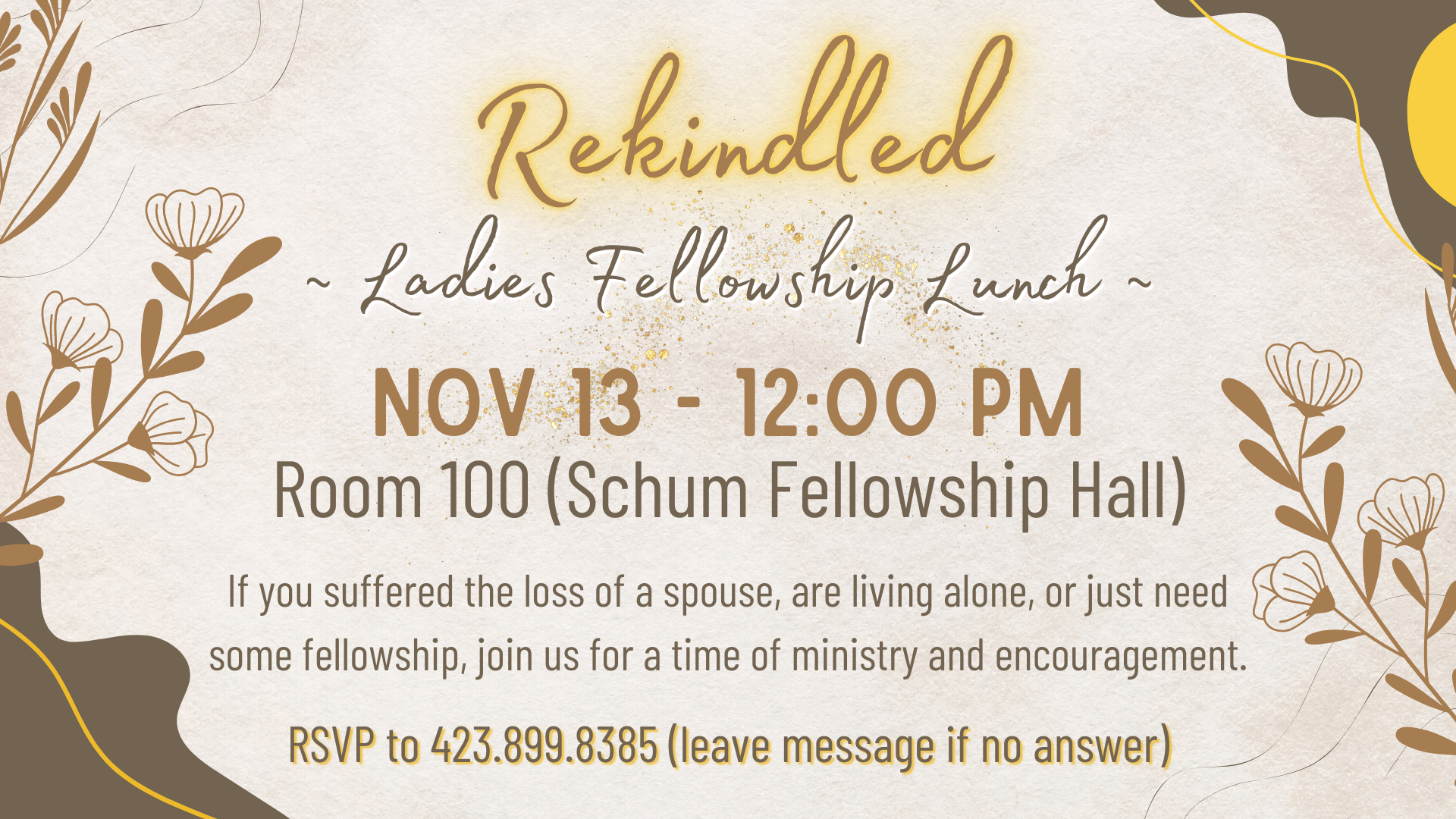 Ladies, if you suffered the loss of a spouse, are living alone, or just need some fellowship, we invite you to come and be rekindled through a time of ministry and encouragement over a light lunch in Room 100 (Schum Fellowship Hall). Please RSVP with Joan at 423-899-8385, if no answer please leave a message.
