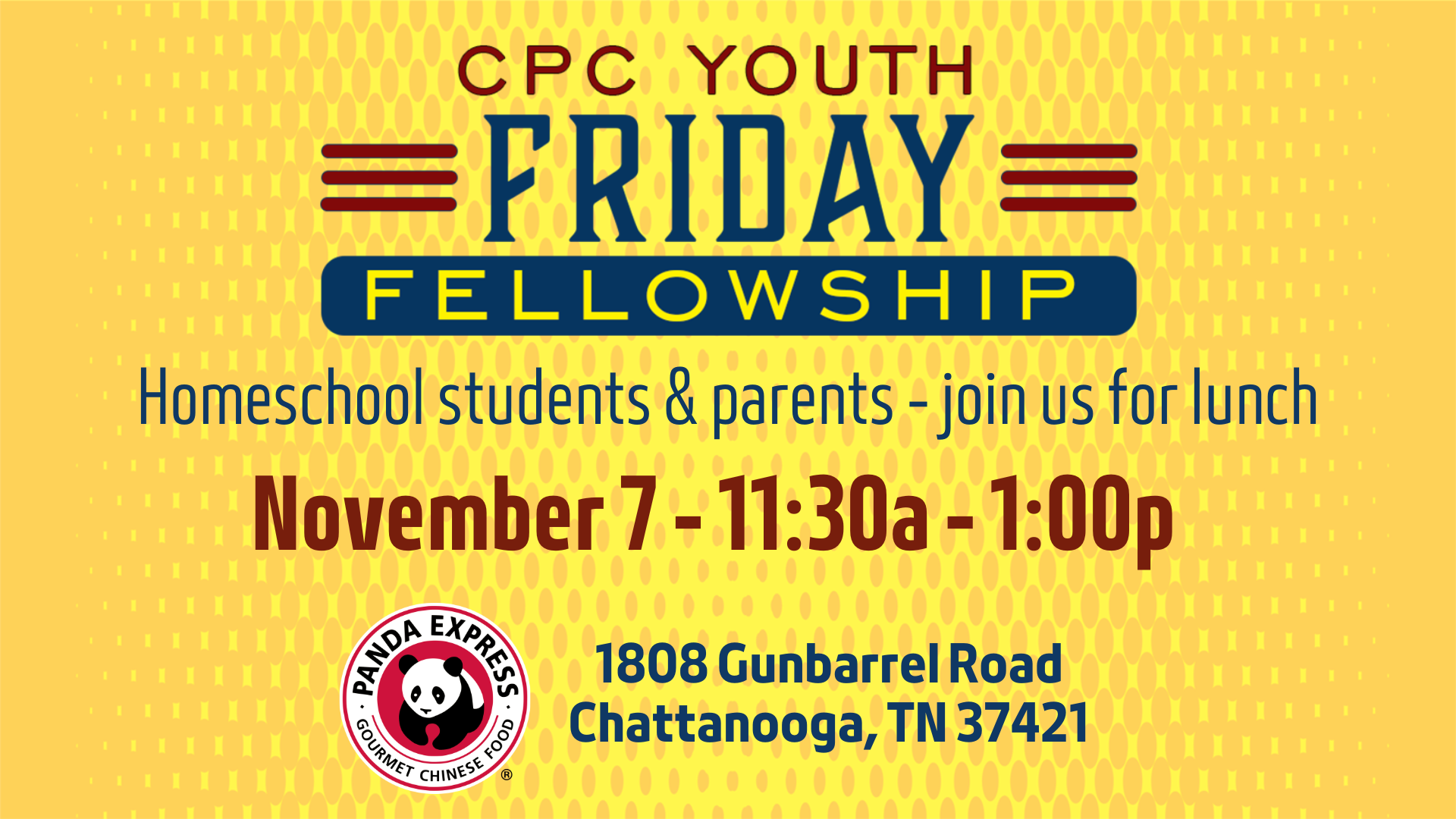 Friday, November 07, 2025, 11:30 AM - 1:00 PM Download: Download EventJoin us for a time of fellowship for our youth homeschool families at Panda Express, 1808 Gunbarrel Road! Parents are welcome.