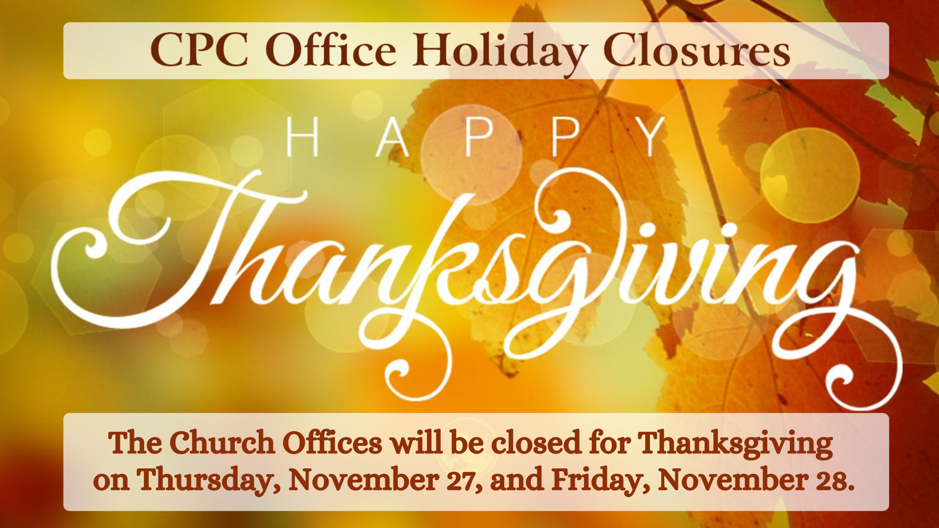 Thursday, November 27, 2025 - Friday, November 28, 2025 Download: Download EventHappy Thanksgiving! The church offices will be closed on Thursday and Friday, November 27-28, in recognition of the holiday. We will be back in the office on Monday!