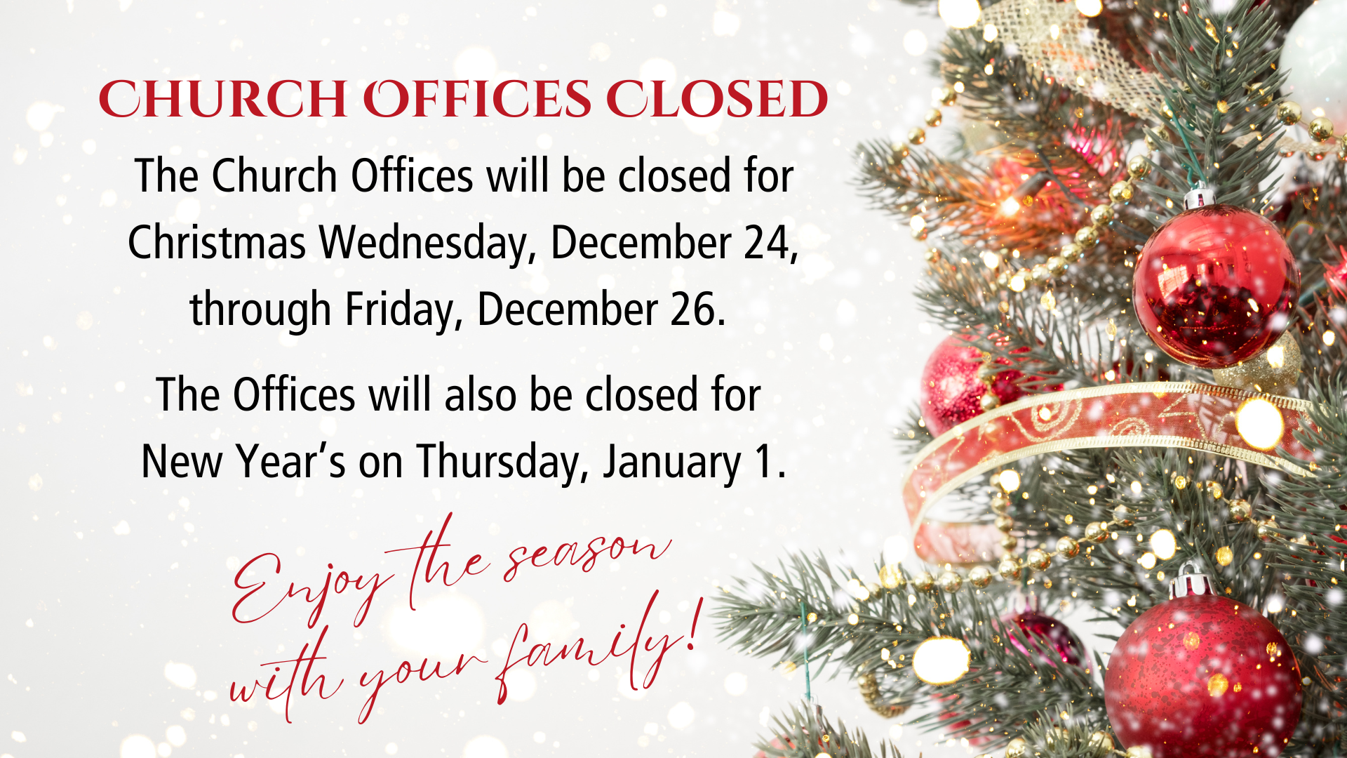 Wednesday, December 24, 2025 - Friday, December 26, 2025 Download: Download EventMerry Christmas! The church offices will be closed Wednesday through Friday, December 24-26, in recognition of the holiday. We will be back in the office on Monday, December 29!