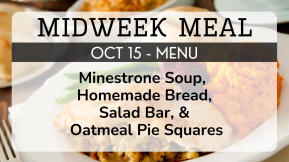 Make plans to join us in Room 100 (SFH) at 5:30 pm. MENU: Minestrone Soup, Homemade Bread, Salad Bar, and Oatmeal Pie Squares There is a collection box on the wall...