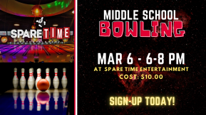 SCROLL DOWN TO SIGN-UP We hope your student can join us for a fun night of bowling at Spare Time from 6-8 pm! The cost is $10. Sign-up is required.