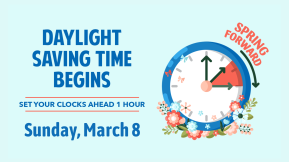 Daylight saving time begins at 2:00 AM. Be sure to set your clocks FORWARD one hour before bedtime on Saturday night.