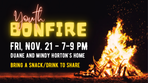 Join us for a youth bonfire at Duane and Mindy Horton's home! Come out for an evening of fun and fellowship! Please bring a drink or snack to share.