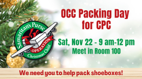 Everyone is invited to come and pack Operation Christmas Child shoeboxes for children around the world - any time between 9:00 am and 12:00 pm. Please make plans to join us!