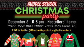 Join us for our Middle School Christmas party at the Hostetlers' home! We will have dinner, games, and a white elephant gift exchange! Bring a dessert to share! Please let...